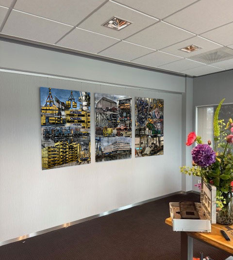 Fine Graphic kreeg de mooie opdracht om een drieluik te realiseren voor Condor Testgewichten, Heijsehaven Vastgoed en Condor Heavy Services. De drie panelen sluiten naadloos op elkaar aan en versterken elkaar, waardoor de onderlinge samenhang tussen de drie BV’s visueel wordt weergegeven.