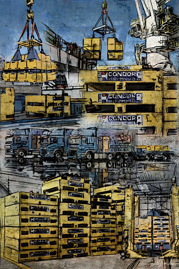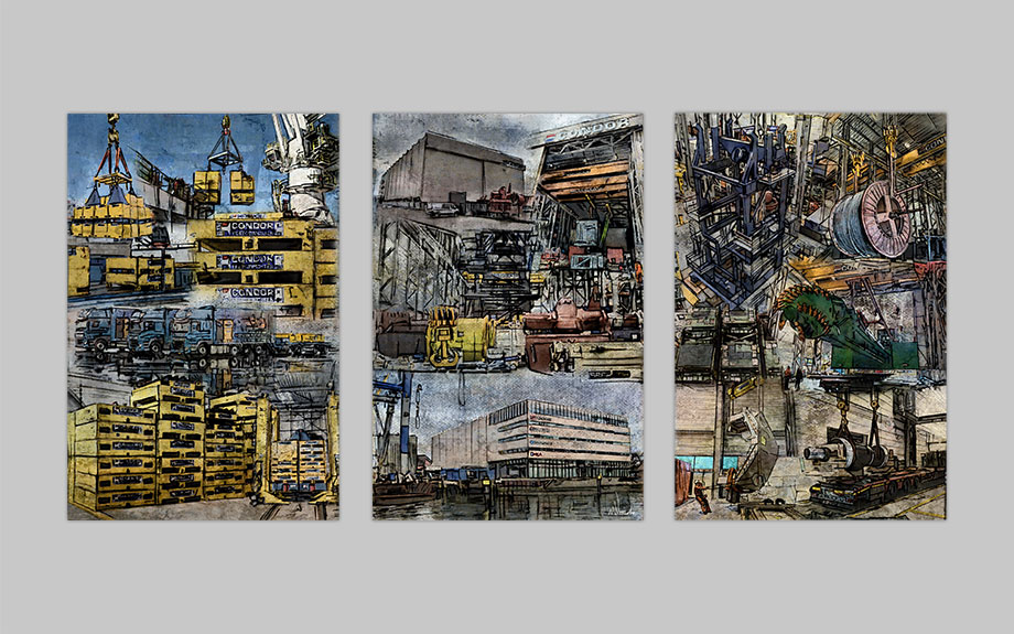 Op het linker paneel zijn de activiteiten van Condor Testgewichten gevisualiseerd. Dit bedrijf verhuurt testgewichten die door honderden bedrijven worden gebruikt om kranen, hijs- en hefinstallaties te testen. Het herkenbare geel van de blokken, de opslag, het vervoer en het testproces zijn allemaal verwerkt in dit werk, waardoor de activiteiten van het bedrijf direct zichtbaar worden.
