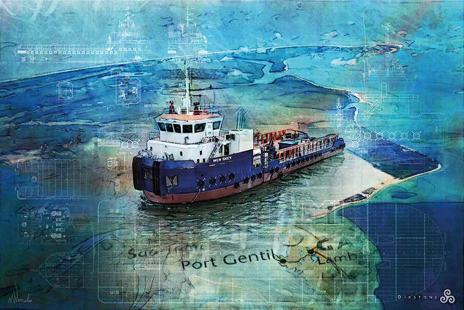 In het kunstwerk staat de Men Skey centraal afgebeeld. Daarnaast zijn de naam Port-Gentil — een havenplaats in Gabon — en de landtong boven deze locatie op de achtergrond verwerkt. Het geheel wordt versterkt door de integratie van technische tekeningen van de schepen, waardoor een levendig geheel is ontstaan.
