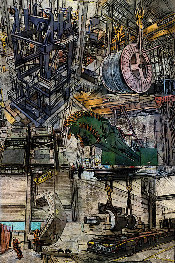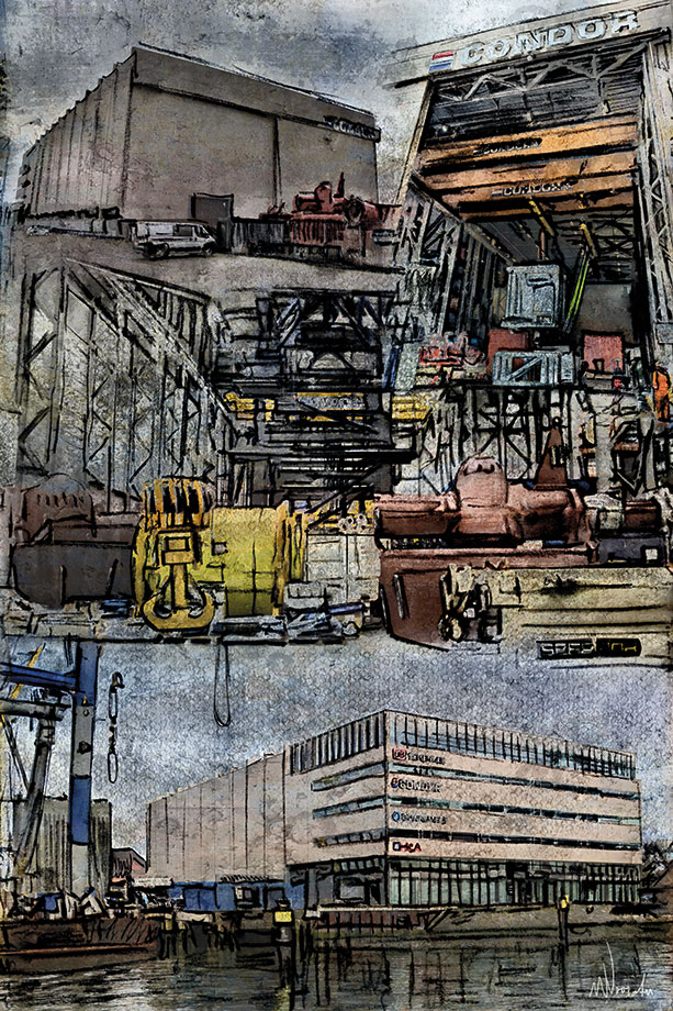 Op het linker paneel zijn de activiteiten van Condor Testgewichten gevisualiseerd. Dit bedrijf verhuurt testgewichten die door honderden bedrijven worden gebruikt om kranen, hijs- en hefinstallaties te testen. Het herkenbare geel van de blokken, de opslag, het vervoer en het testproces zijn allemaal verwerkt in dit werk, waardoor de activiteiten van het bedrijf direct zichtbaar worden.